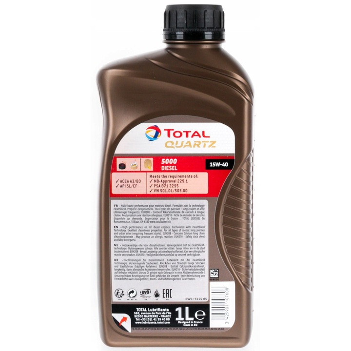 TOTAL QUARTZ 5000 DIESEL 15W-40 este un ulei de motor multigrad conceput pentru a satisface cele mai stricte cerinte ale motoarelor diesel fara filtre de particule diesel (DPF). Poate fi folosit la motoare care functioneaza in diverse conditii (trafic urban, extraurban, autostrazi) indiferent de anotimp. Asigura curatenia si protectia optima a motorului. Formula unica asigura rezistenta ridicata la oxidare.